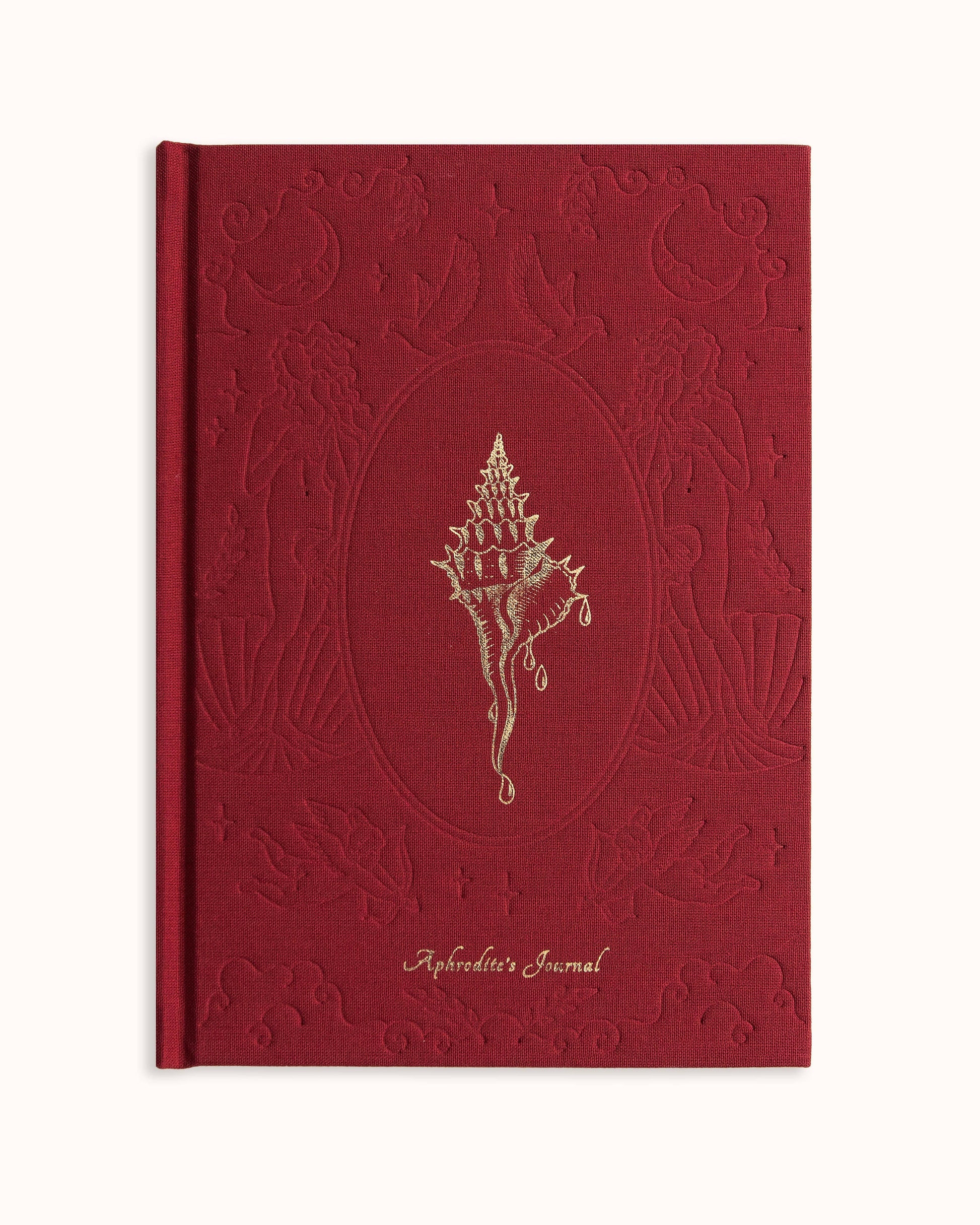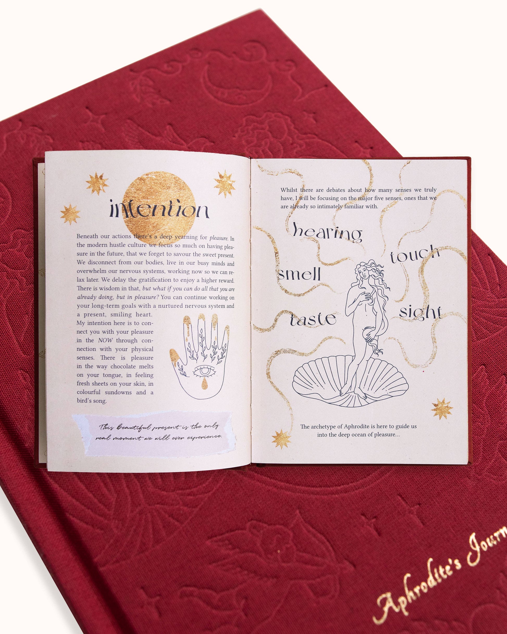 Cloth-bound and adorned in gold foil, Aphrodite's journal is filled with pleasure rituals, deep prompts and a daily self-love journaling spread. In the modern hustle culture we focus so much on having pleasure in the future, that we forget to savour the sweet present. We disconnect from our bodies, working now so we can relax later.