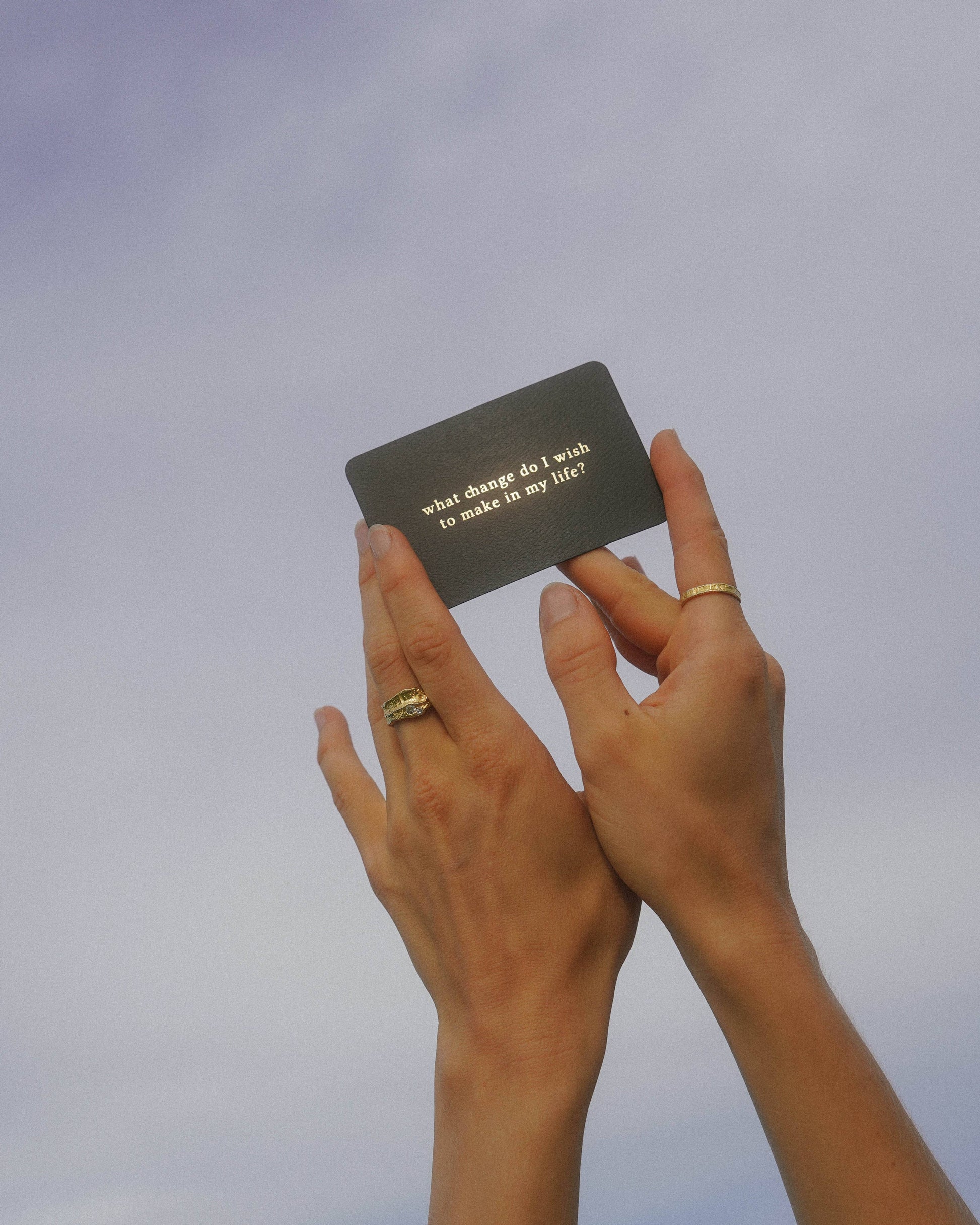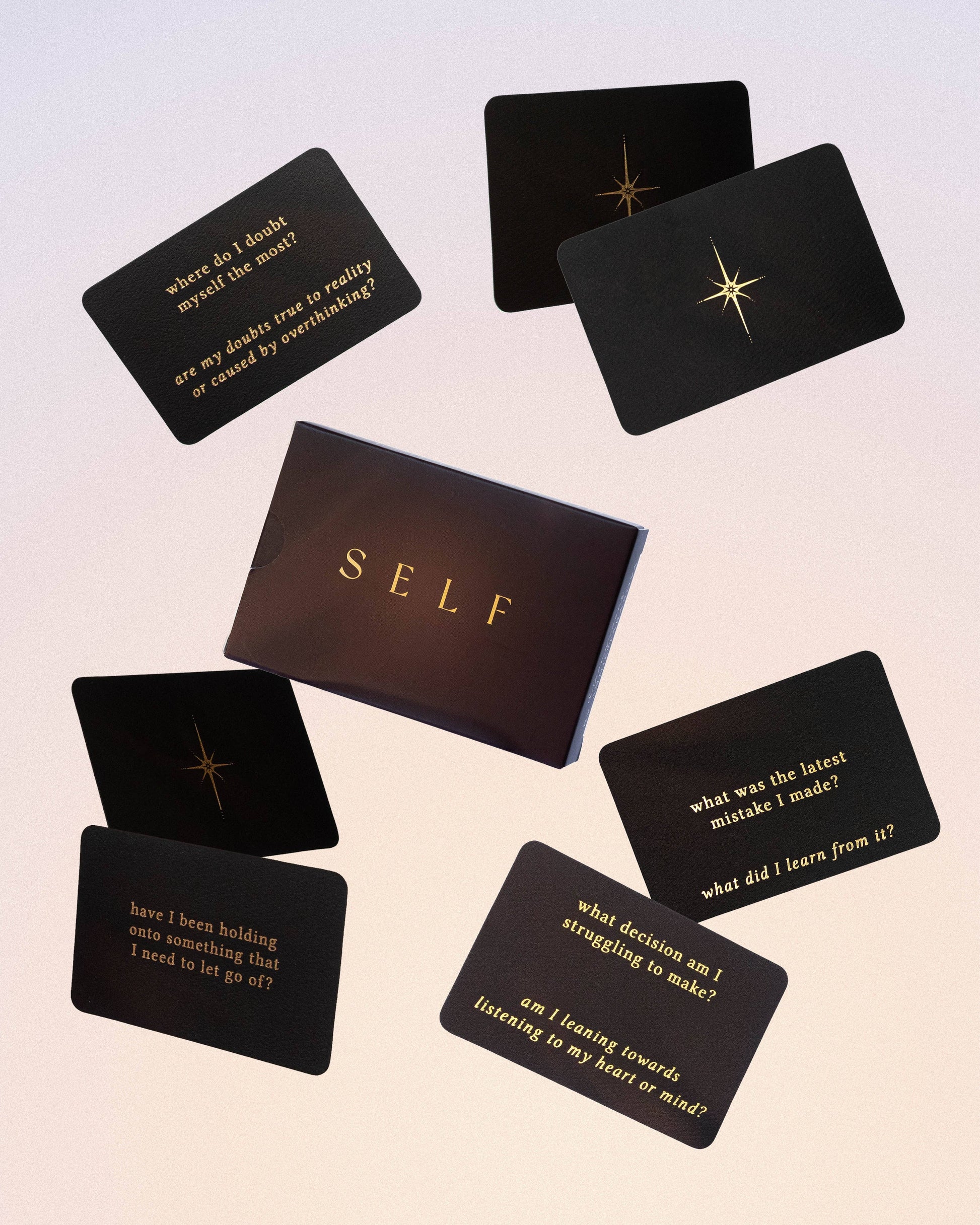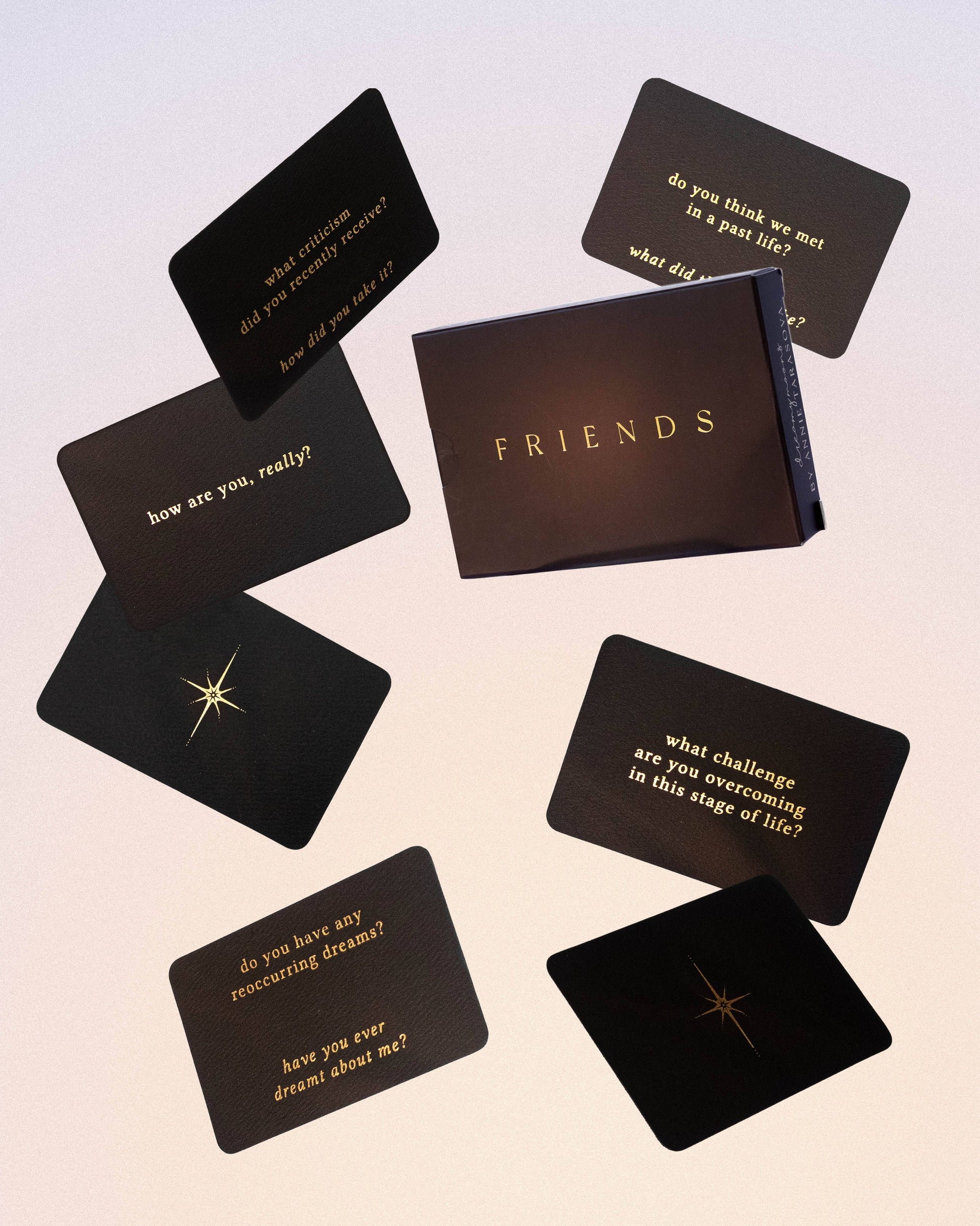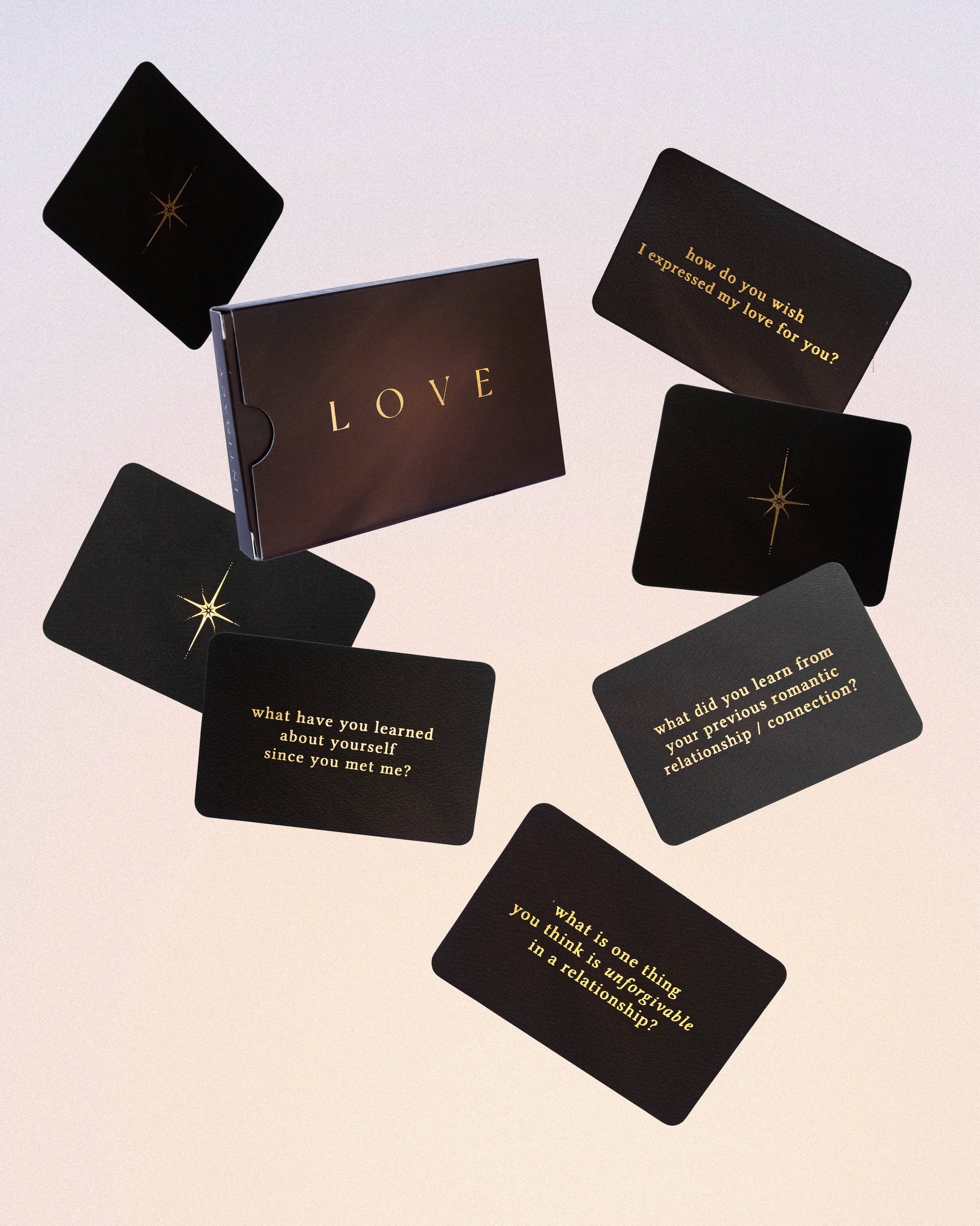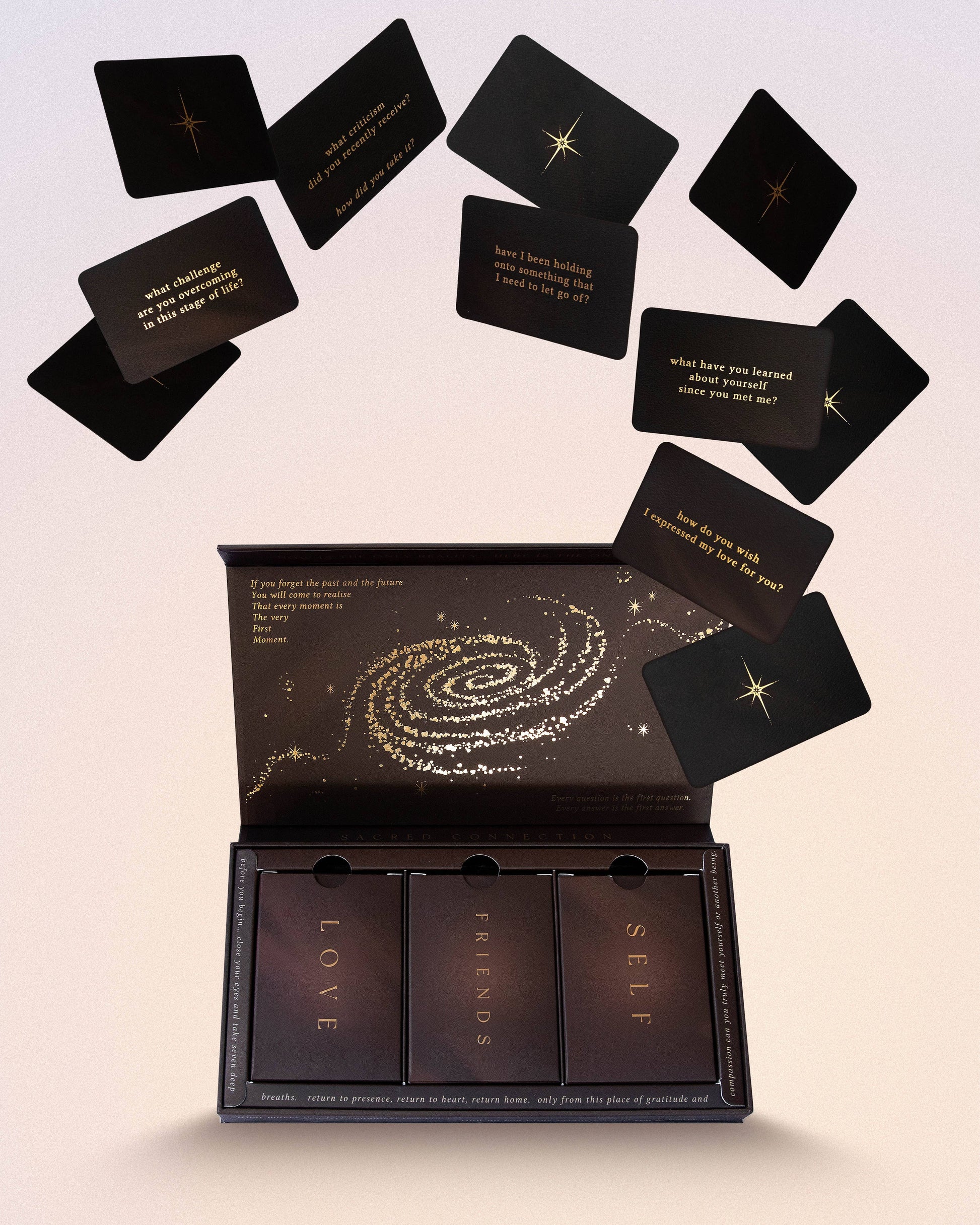 This project was inspired by mind-opening and heart-opening conversations about subjects that truly matter, with others and with myself. May these cards encourage you to think deeper, go further, and connect more intimately with those around you. Inside the box, you will find 3 card decks: "Self", "Friends", and "Love".