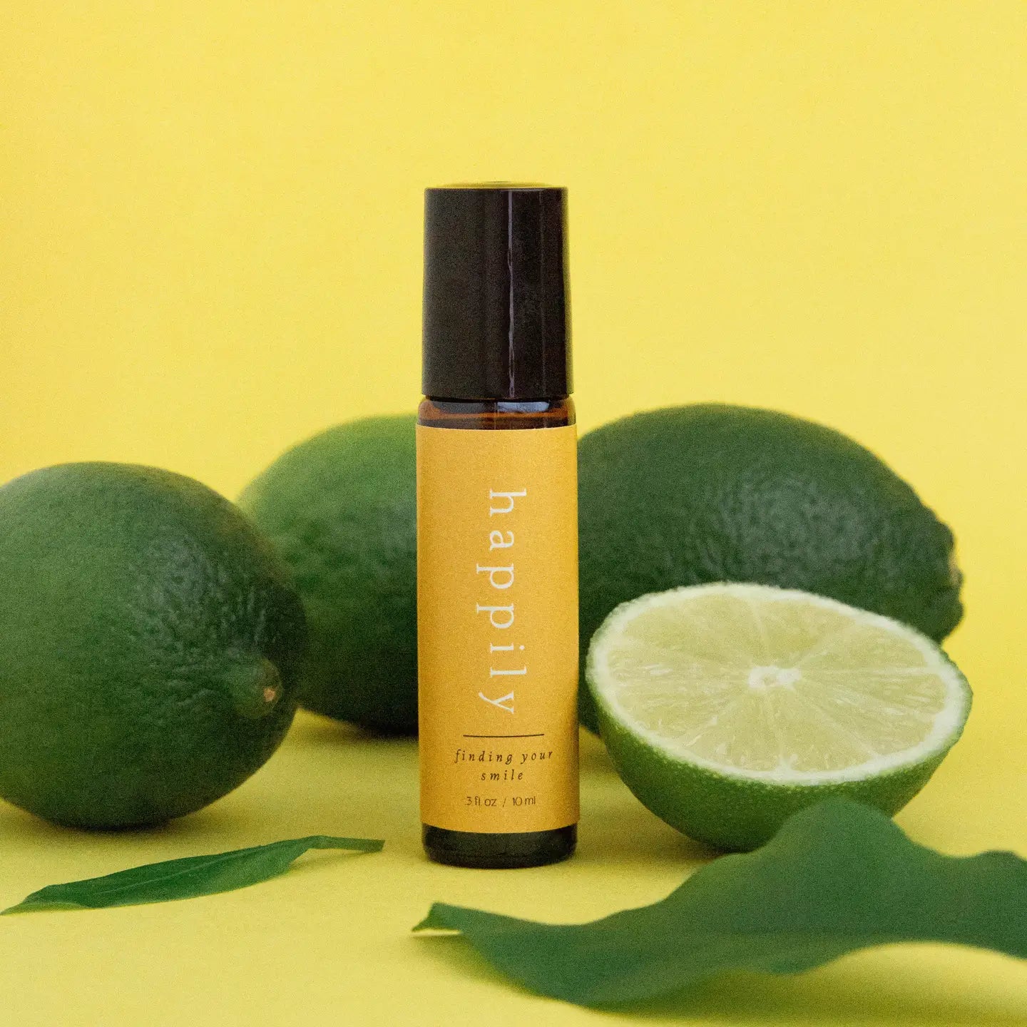 Happily - bergamot, lavender, ylang ylang, geranium, lemon, coriander, tangerine, jasmine, chamomile, and rose essential oils in an organic coconut oil carrier.