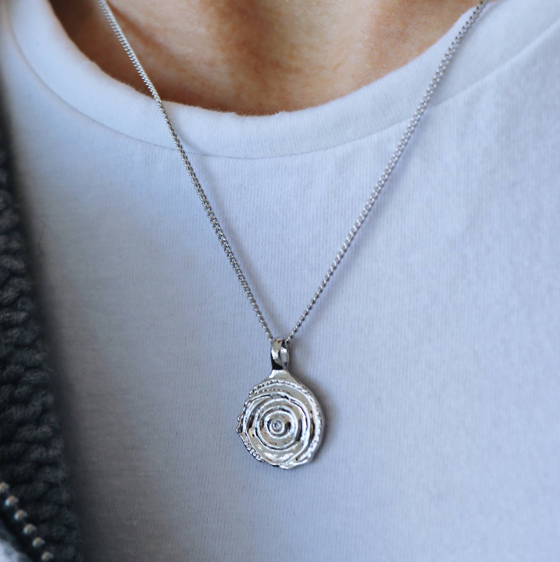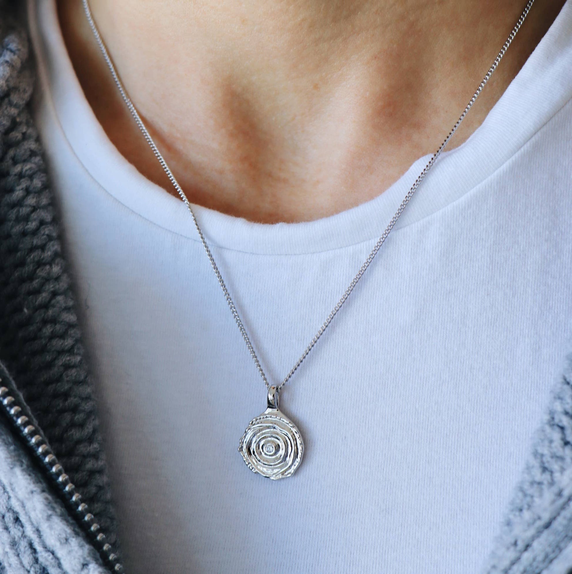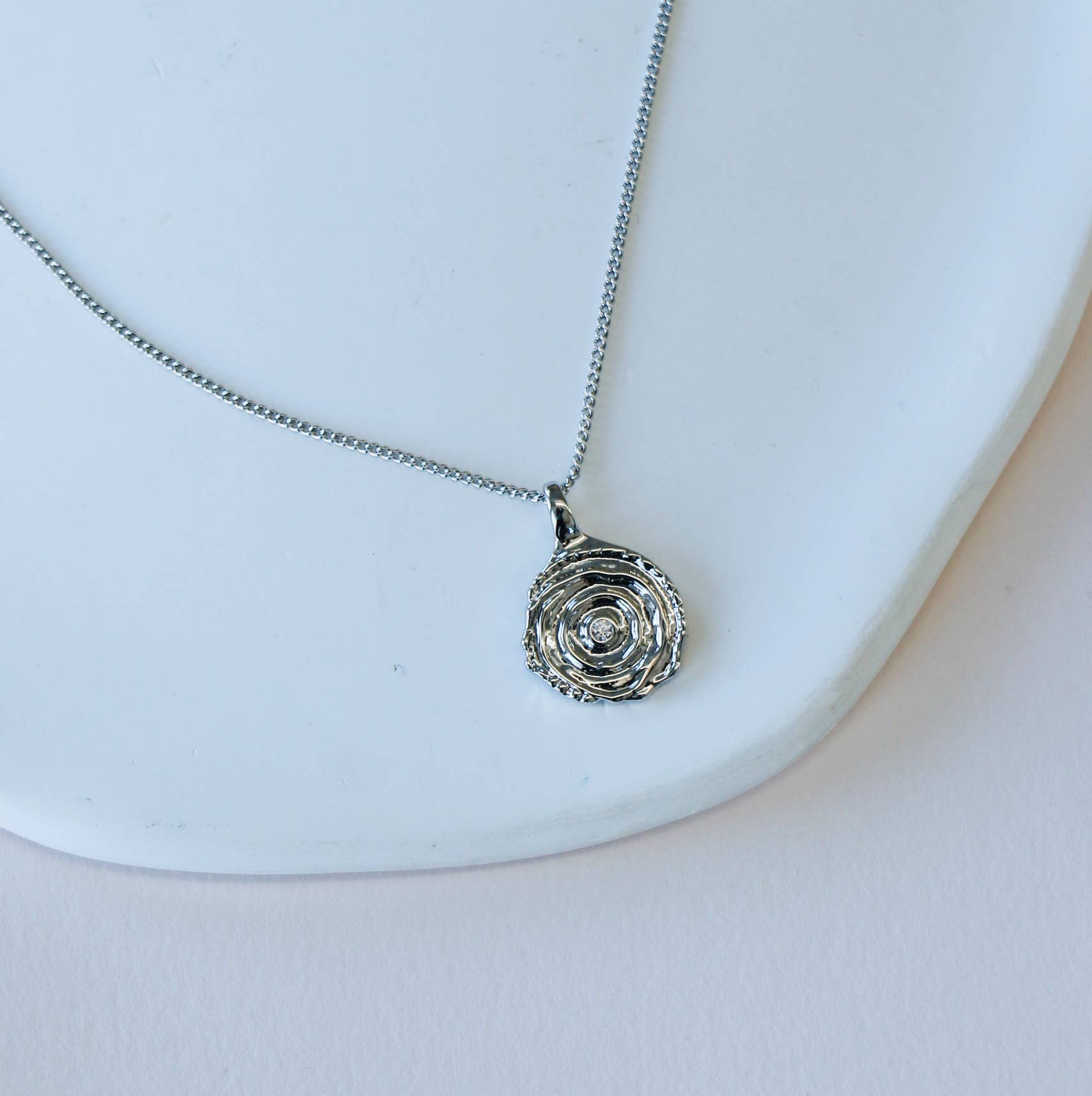 Flat link chain necklace with textured pendant with clear zircon in its center.