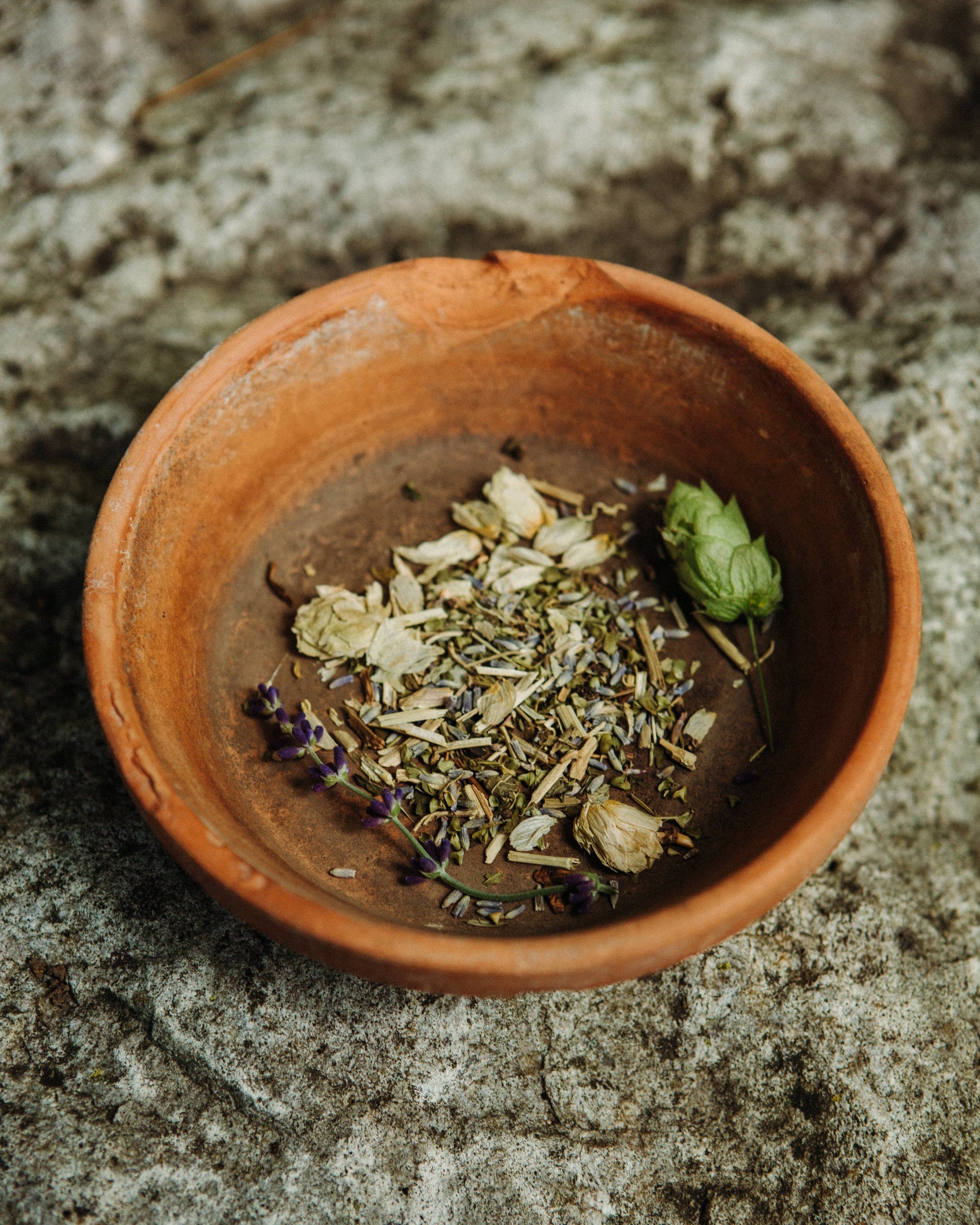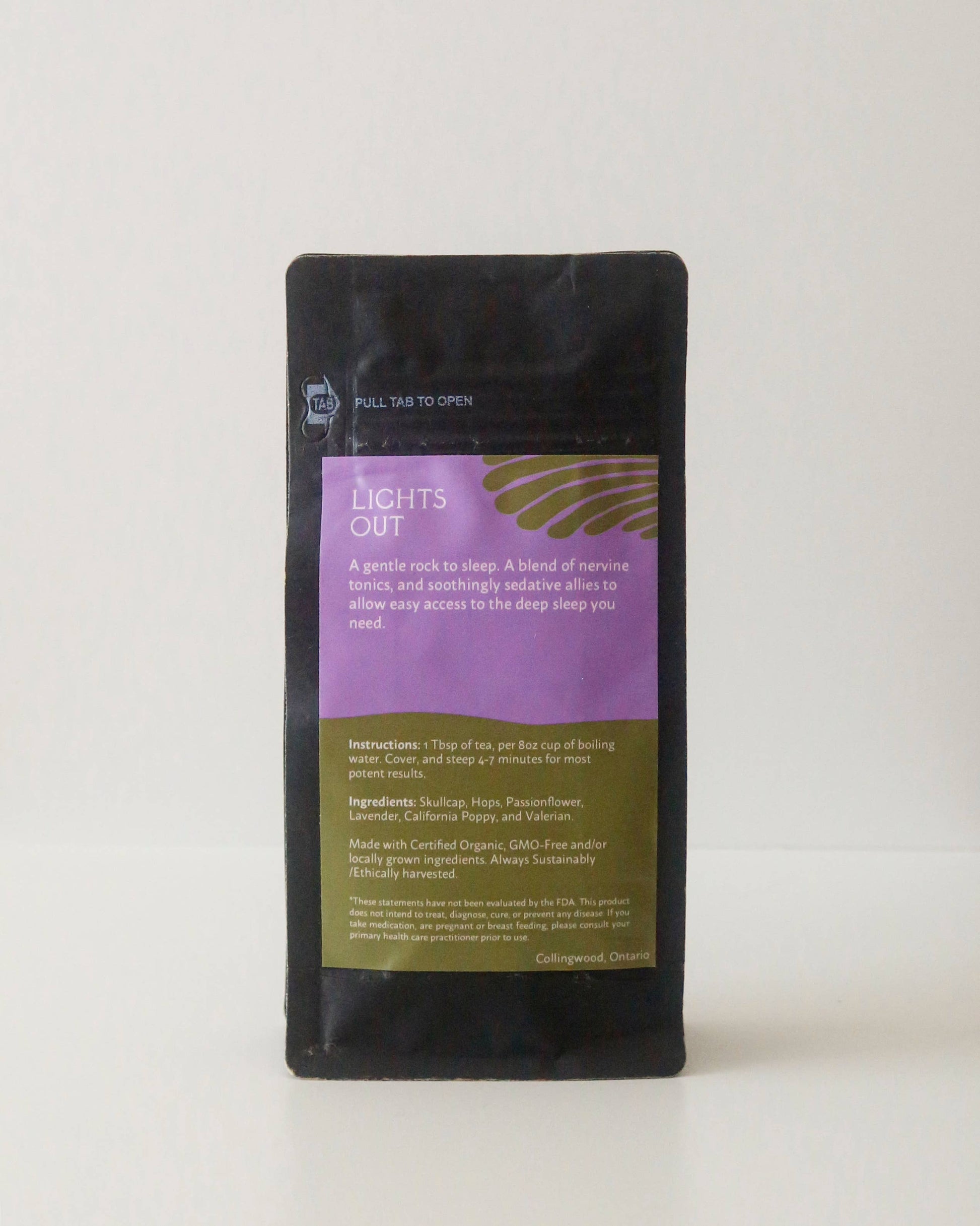 Ingredients: Skullcap, Hops, Passionflower, Lavender, California Poppy, and Valerian. 50g (Approximately 20-25 Servings) Made with Certified Organic and/or locally grown ingredients. Sustainably/Ethically harvested.