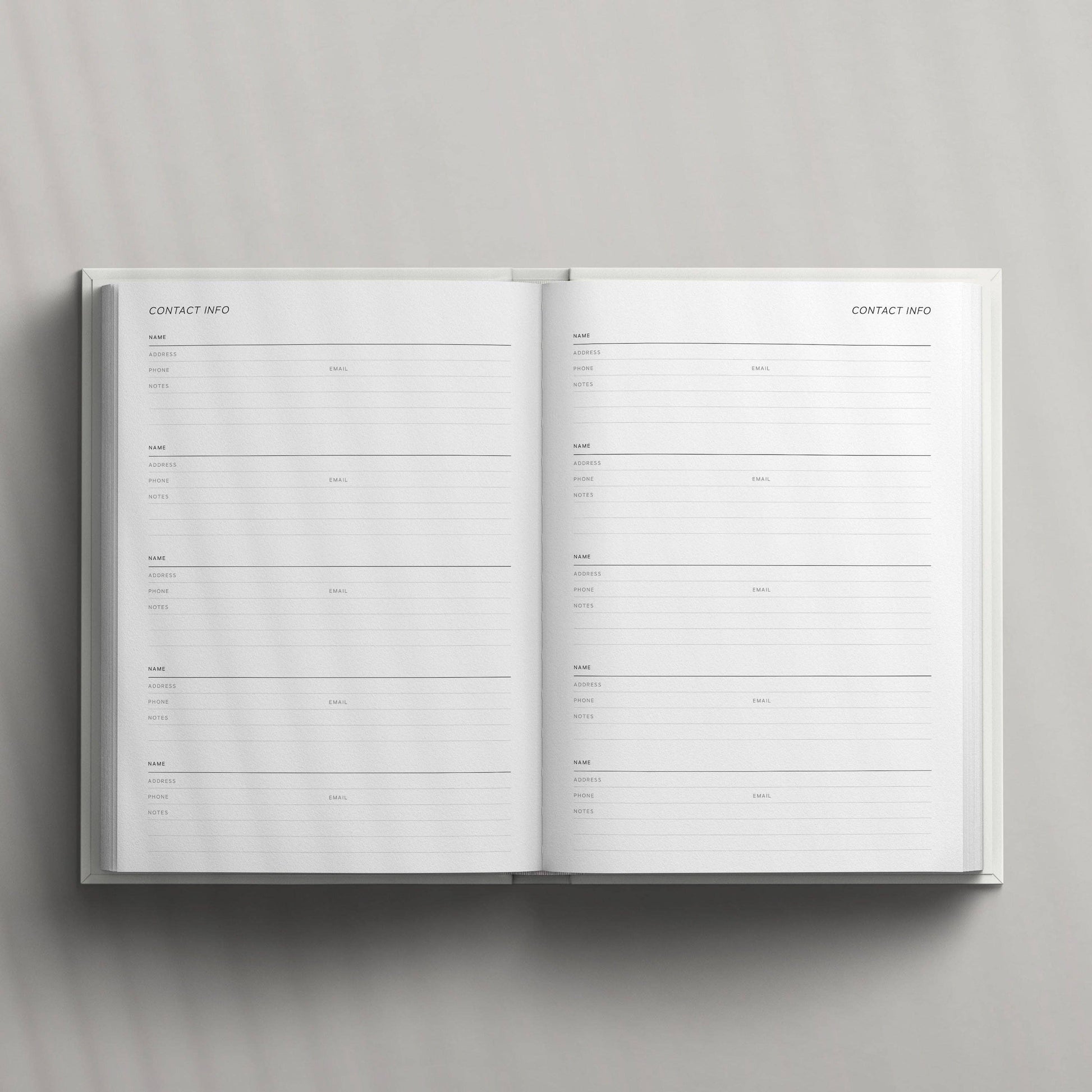 - Equipped with sections for yearly, monthly, and weekly planning, along with contact and password info, lists pages, and grid notes