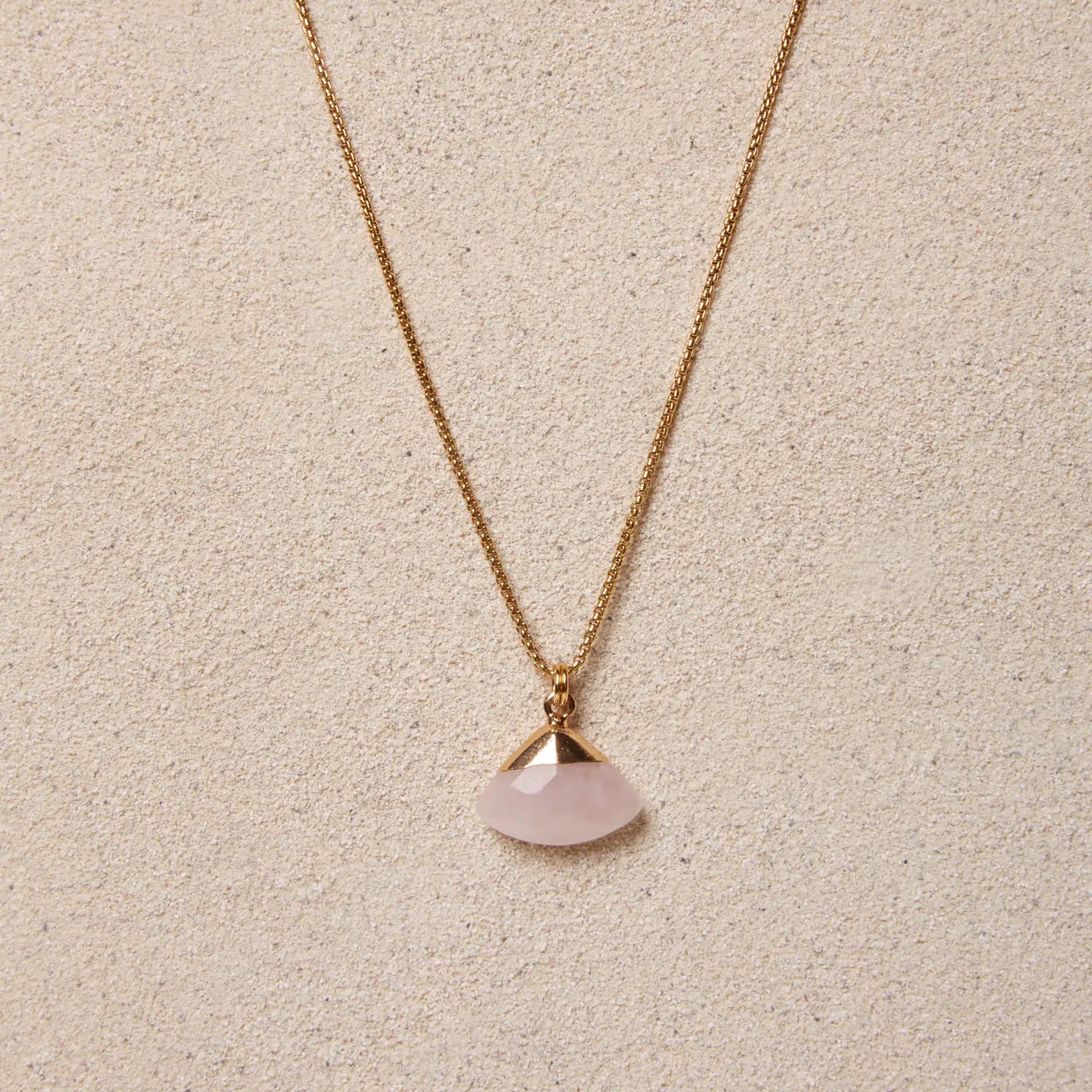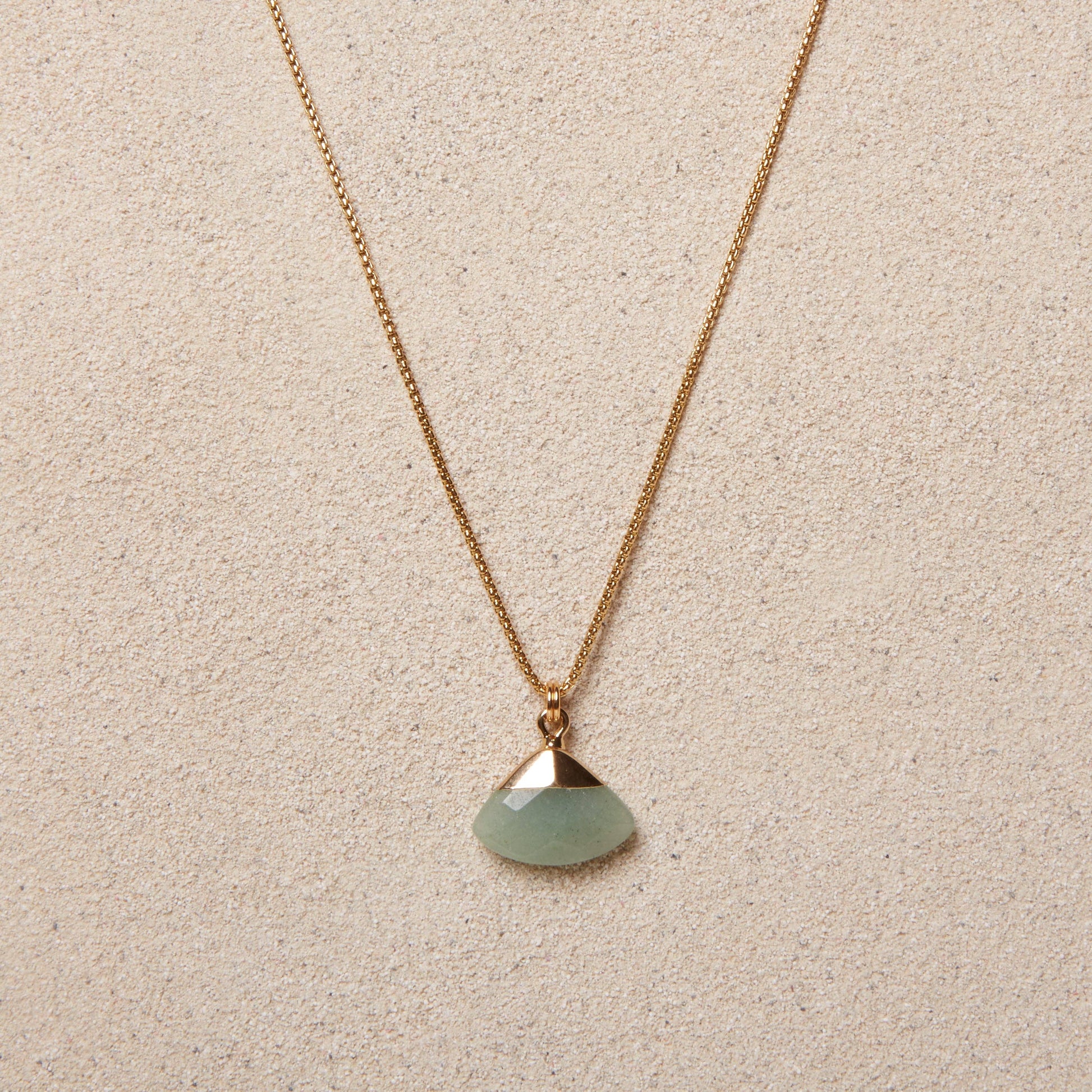 A fan shaped crystal pendant suspended on an adjustable gold chain where you can slide a toggle along the chain to create your perfect length.
