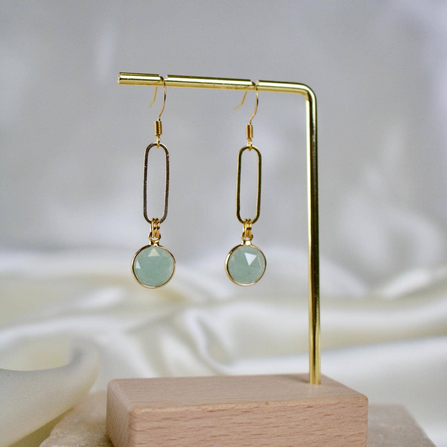 A simple take on a dangle earring featuring a small round crystal charm suspended from gold oval link.