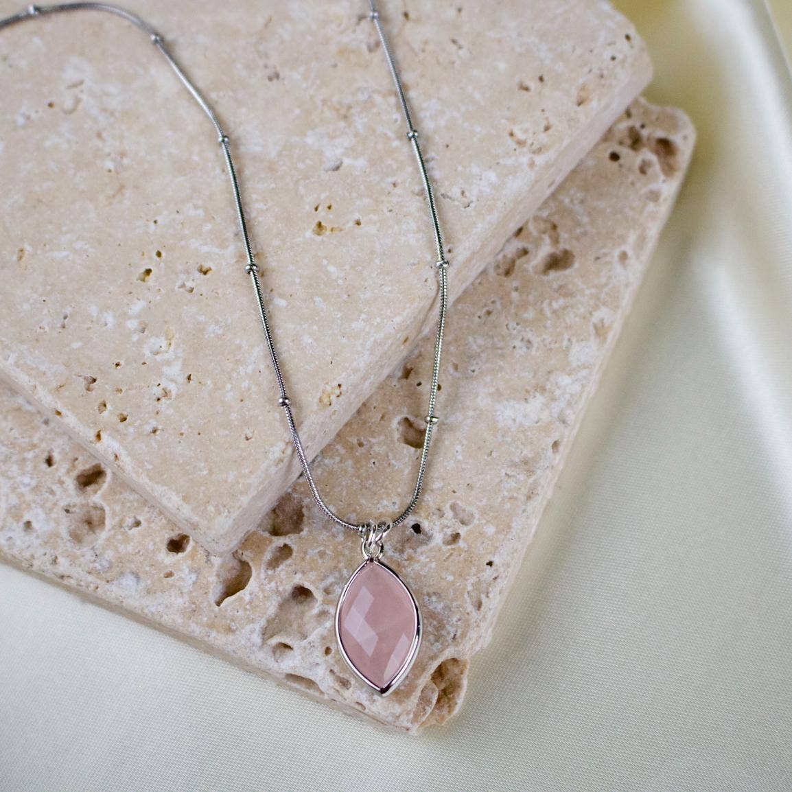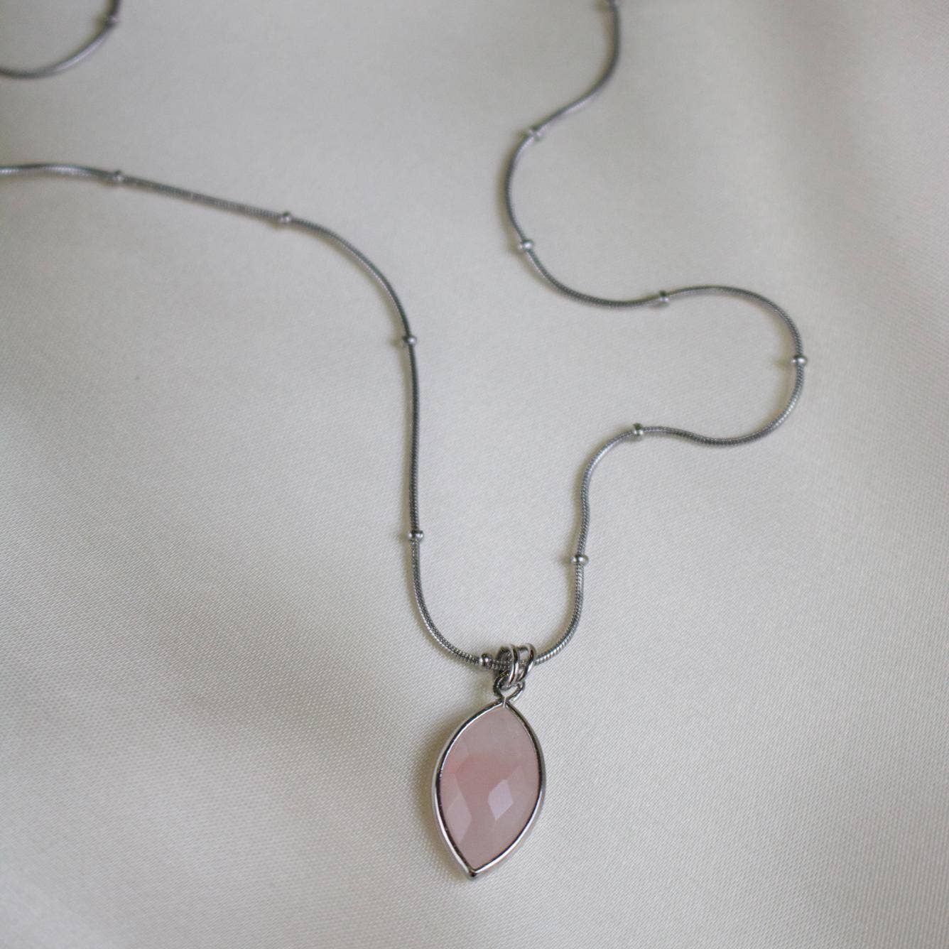 The Suzie necklace features a rose quartz charm on a silver satellite style chain necklace.